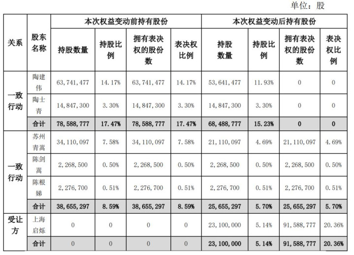 随着棒杰股份陷入危机,公司实控人陶建伟选择出让控制权离场。2025年7月,陶建伟及其一致行动人、苏州青嵩及其一致行动人以0.97亿元的对价,向上海启烁转让了公司5.14%的股权,陶建伟及其一致行动人还将所持的15.23%的表决权委托给上海启烁。