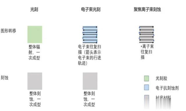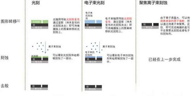 FIB技术与光刻技术在加工原理和应用上有着本质的区别。光刻技术依赖于光通过掩模照射到光刻胶上,通过化学显影过程转移图案。而电子束光刻则使用电子束直接在电子抗蚀剂上写入图案。相比之下,FIB技术无需掩模或光刻胶,可以直接在样品表面进行加工,这使得FIB在加工复杂三维结构时具有更大的灵活性。然而,FIB的加工速度相对较慢,且存在再沉积现象,这些是其局限性所在。