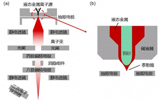 FIB系统的心脏是离子源,通常采用的是液态金属离子源,比如镓离子源。这种离子源利用钨针尖作为发射极,通过加热使金属镓形成液态,并在针尖施加电场,促使液态金属形成细小的离子流。这些离子流经过聚焦系统后,被聚焦成极细的离子束,通过偏转系统控制,精确地扫描样品表面。此外,FIB系统还包括真空系统和监测设备,如扫描电子显微镜(SEM),用于实时监测加工过程和结果。